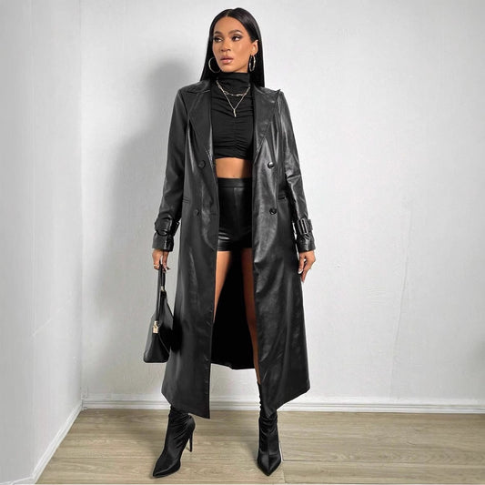 Damen Eleganter und modischer Trenchcoat aus Kunstleder Merchesia